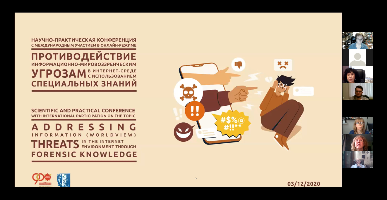 3 декабря 2020 г. на платформе Zoom прошла научно-практическая конференция на тему «Противодействие информационно-мировоззренческим угрозам в интернет-среде с использованием специальных знаний», организаторами которой выступили кафедра судебных экспертиз Московского государственного юридического университета имени О. Е. Кутафина (МГЮА), Российский федеральный центр судебной экспертизы при Министерстве юстиции Российской Федерации (РФЦСЭ) и Центр академического развития и образовательных инноваций МГЮА.